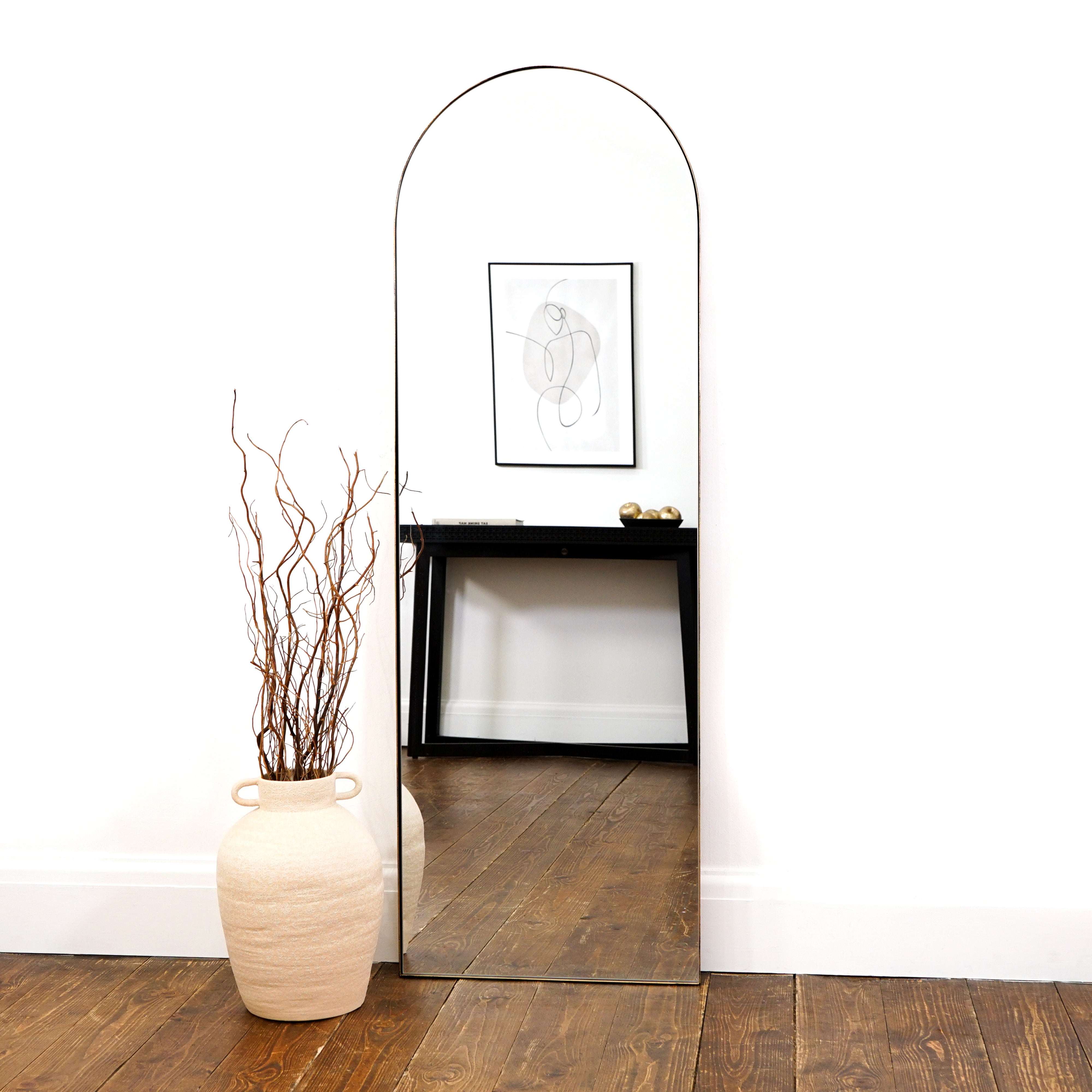 O novo espelho Theo de corpo inteiro com formato arqueado apresenta uma moldura metálica de perfil extremamente fino, afirmando-se como uma adição contemporânea e elegante para a sua casa. Os acabamentos incluem Preto Mate e Dourado Vintage, pintados à mão sobre uma estrutura metálica soldada, conferindo um toque industrial ao design.